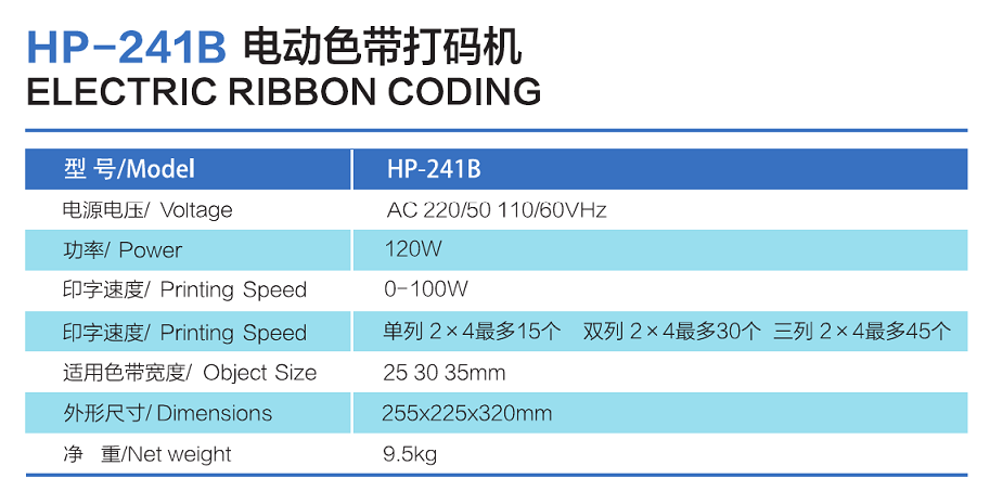 HP-241B色帶熱打碼機可以在紙張,薄紙板,皮革,塑料薄膜,鋁箔等材料上印制標簽。