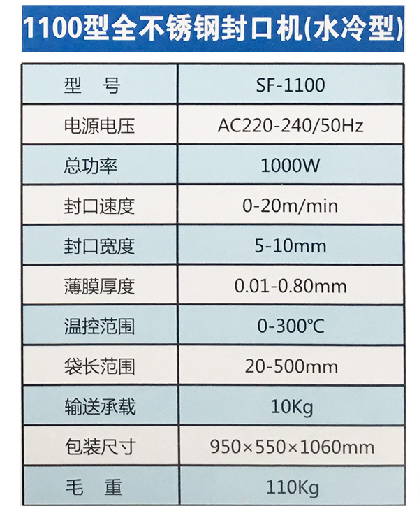 本產(chǎn)品由全不銹鋼材料制作而成,利用水循環(huán)系統(tǒng)冷卻,冷卻效果好,減少薄膜封裝產(chǎn)品的廢品率,提高了封口質(zhì)量。主要用于不同類型的單薄膜,吹塑膜,復(fù)合膜。